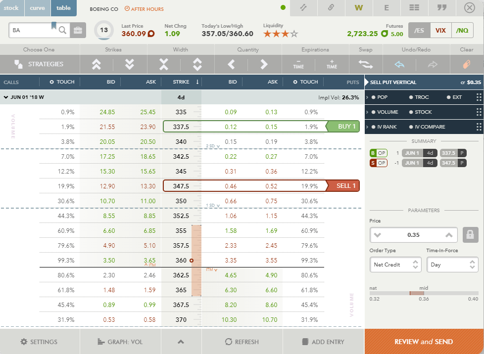 The nearest out of the 1 SD range put strike is at $350. To offset this a bit further, I would choose $347.50 strike. I would also go with $10 (or $1000 dollar) wide spread, so my long put strike would be at 337.50.
