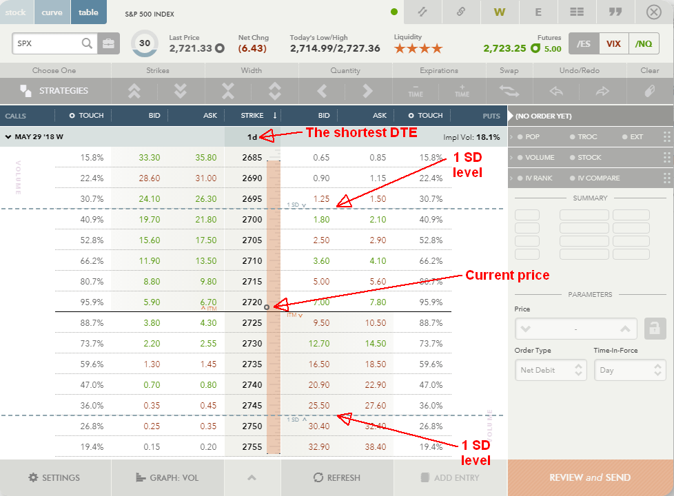 2) Now, I can create a trade to choose strikes outside the 1 SD level. It is a safe bet but there is still about 30% chance that this level gets touched and only about 13% chance that it will get in the money. The probability of a successful trade is 87%.