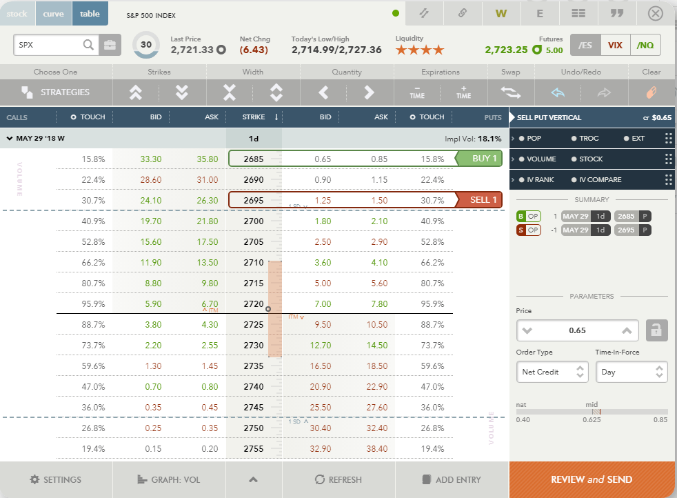 The first strike outside the 1 SD range in our example is 2695. So I select that as a short strike. Because I cannot trade naked puts against SPX (not big enough account), I need to trade spreads. The nearest 10 dollar wide spread strike would be 2685 strike, so I place a buy: