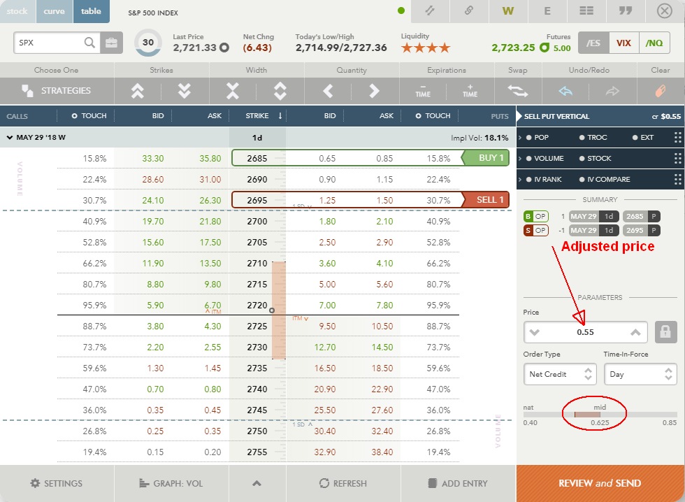5) But again, the mid point shown in the trade wouldn’t get us into the trade, so we need to adjust it: