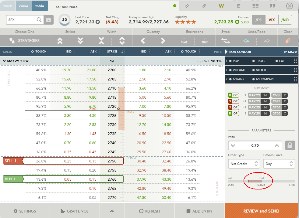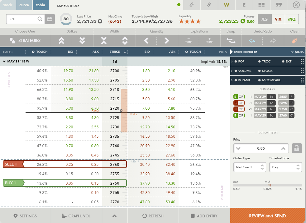 4) Now we could go and place the order but since above we established that the market is in a range bound trend and an Iron Condor would be appropriate, instead of placing a single vertical put spread, let’s add a call spread. Again, the nearest strike out of the 1 SD range is 2750 level. I choose this one as my short strike and then add a long strike to it to create $10 dollar wide call spread. The strike would be 2760: