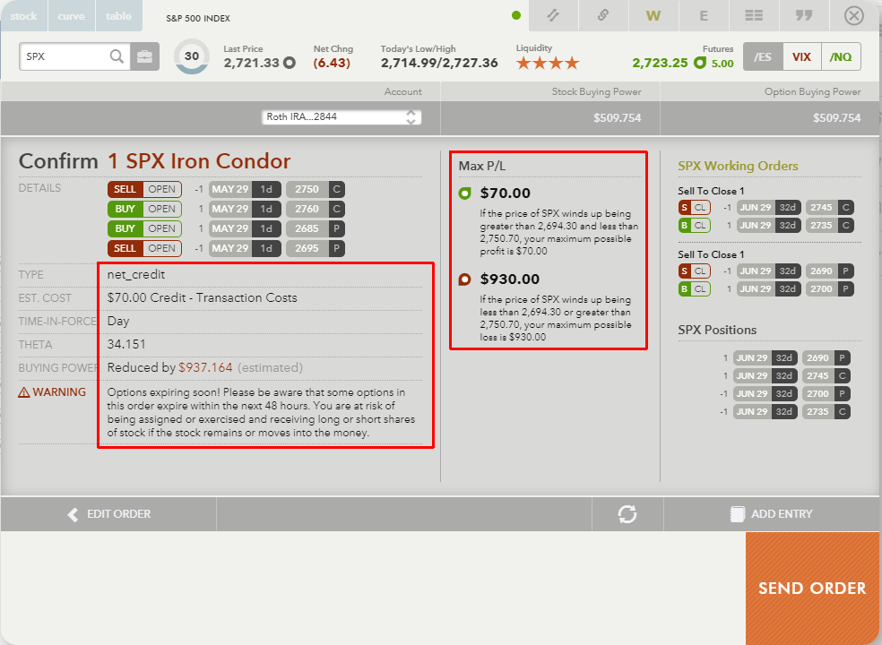 2) Now the process would be the same as with SPX. Let’s review the trade as if I was placing it today (ignoring that it is a Memorial Day today) and check Friday’s expiration.