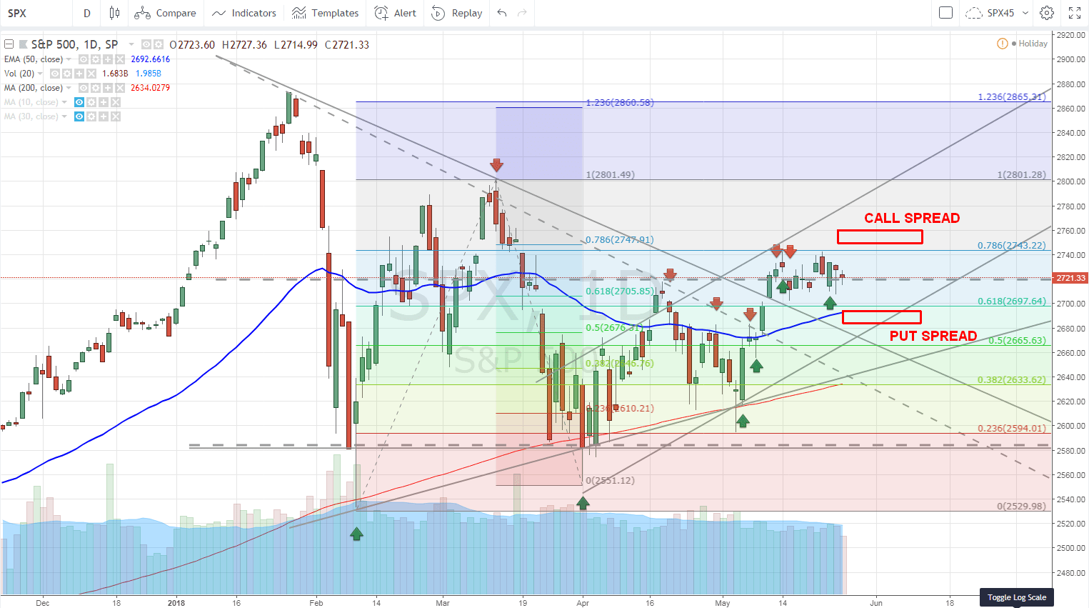 Adding a call spread and adjusting the mid point to 0.60 ($60 dollars) premium in 4 days is an excellent trade and I would place it. But beofre I go and hit enter, I want to again review the chart to see where my trade will be standing at: