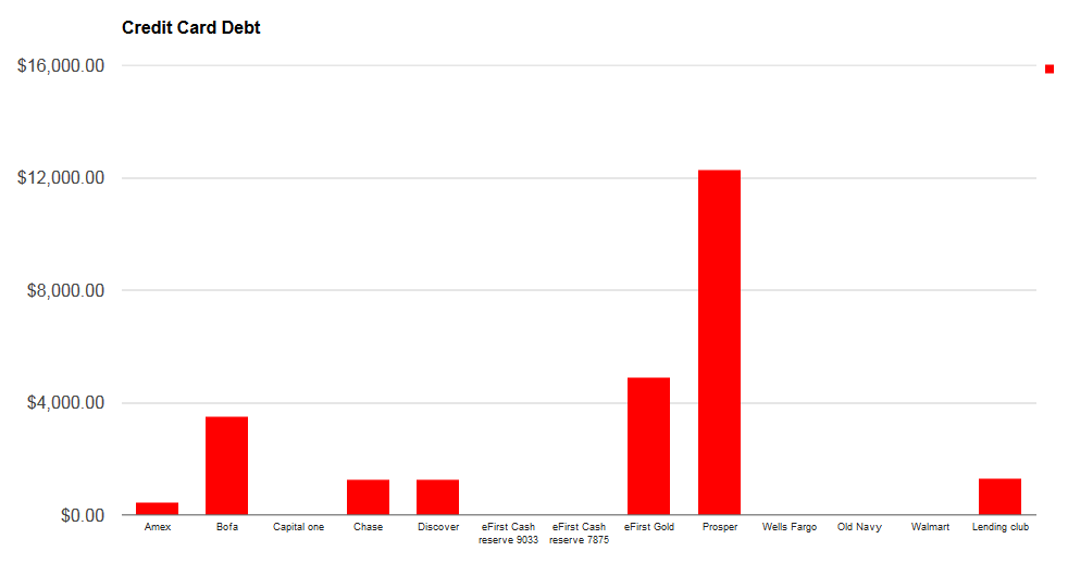 The following chart show all my cards and debt I carry on. After my Amex is gone I will use a snowball method eliminating the smallest debt first and moving on.