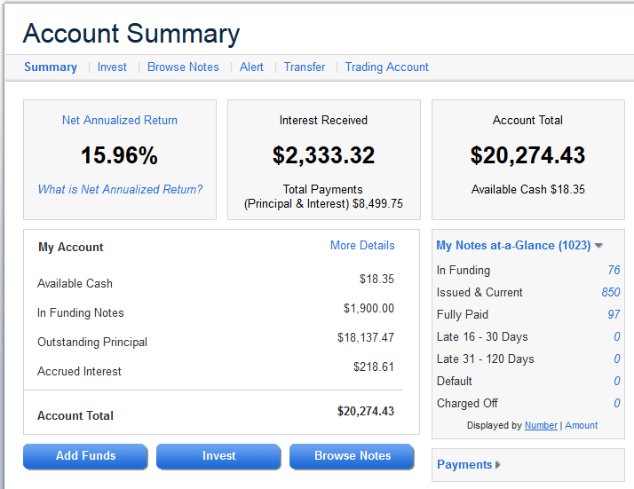The picture above shows my account at Lending Club. Note zero late or default notes as I continue actively managing this account and trying avoiding all notes which may potentially turn bad. You can also follow my Lending Club account on my Lending Club Holdings page.