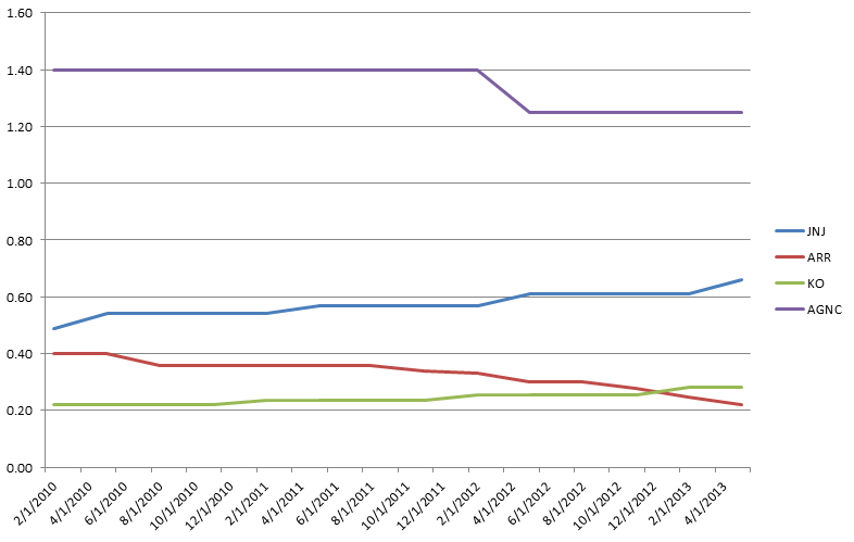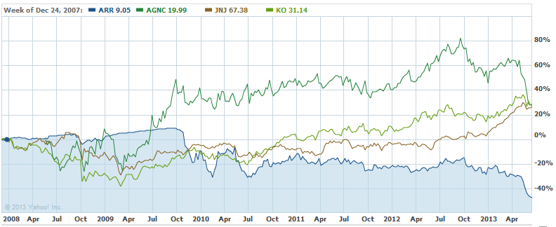 When taking look at ARR chart and compare it with any other dividend paying stock such as JNJ, KO, or even AGNC (the closest competitor of ARR), you will see a totally different picture: